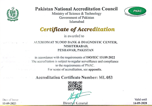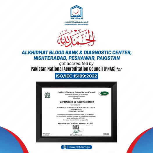 The Alkhidmat Blood Bank and Diagnostic Center Nishtarabad Peshawar received official accredation from the Pakistan National Accredation Council (PNAC) under the ISO/ICE 15189:2022 standard.